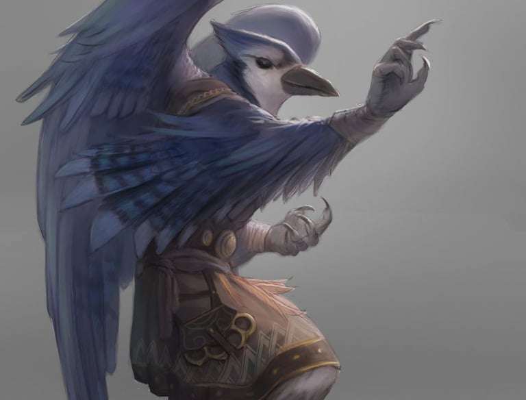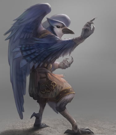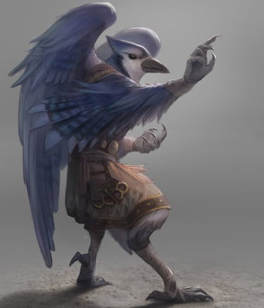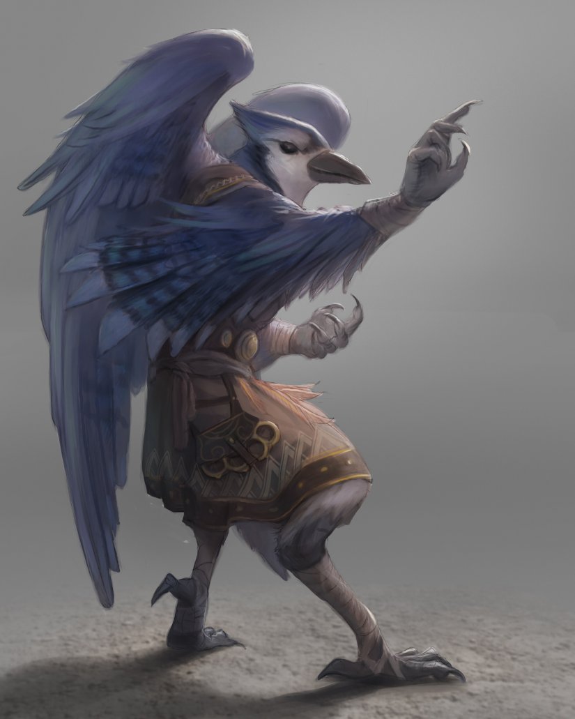 Un águila bípeda con brazos emplumados, con pico y sus pies terminan en garras de águila. No vuelan pero planean con facilidad siempre que no tengan peso encima. Son decididos, valientes, sabios y muy inteligentes, desde luego una raza curiosa como ninguna.